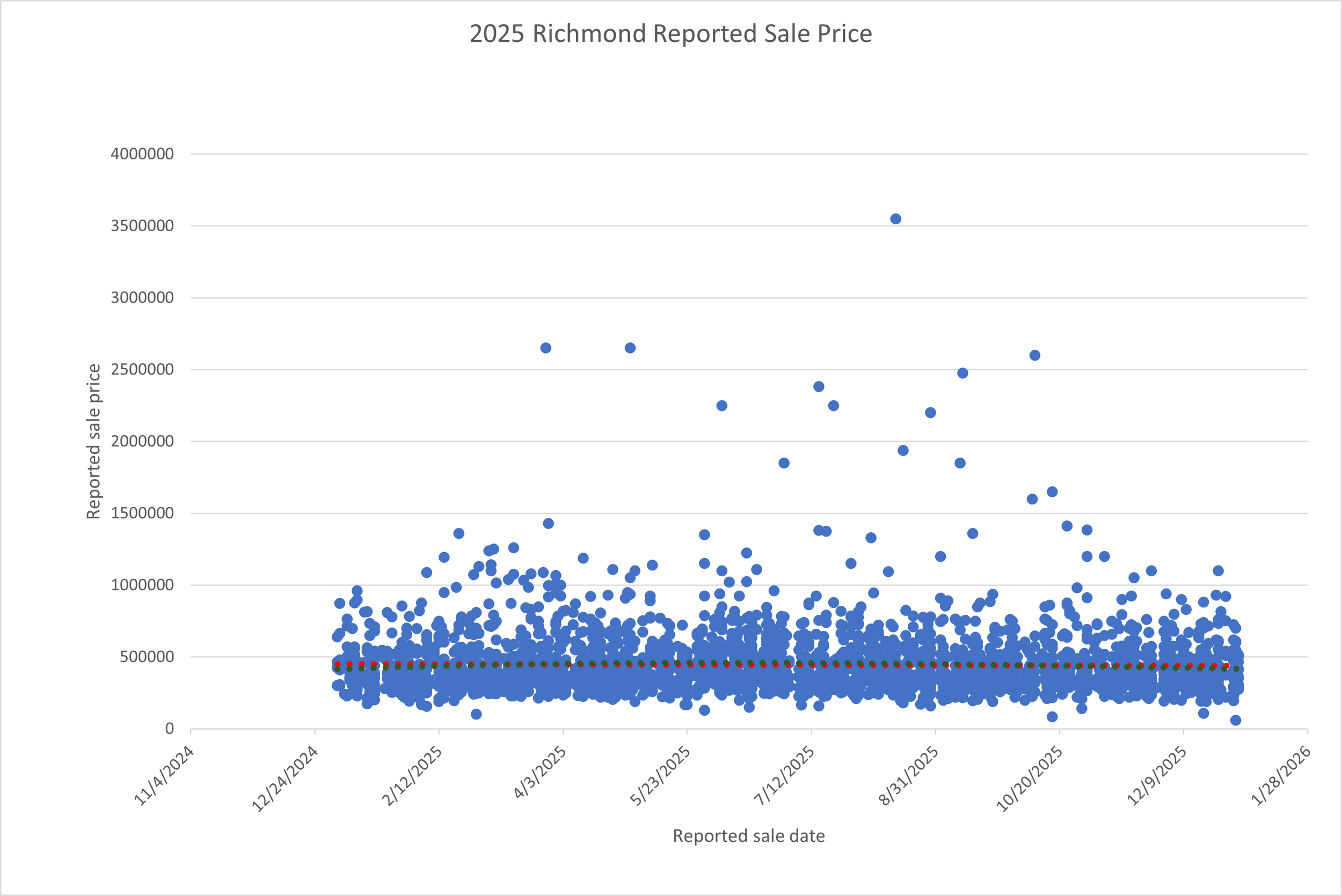 Reported sale prices in Richmond during 2025 exhibited a wide range, with most transactions clustering within a relatively consistent pricing band. While individual sales varied significantly, the overall distribution reflects a market experiencing gradual downward pressure rather than abrupt price correction.