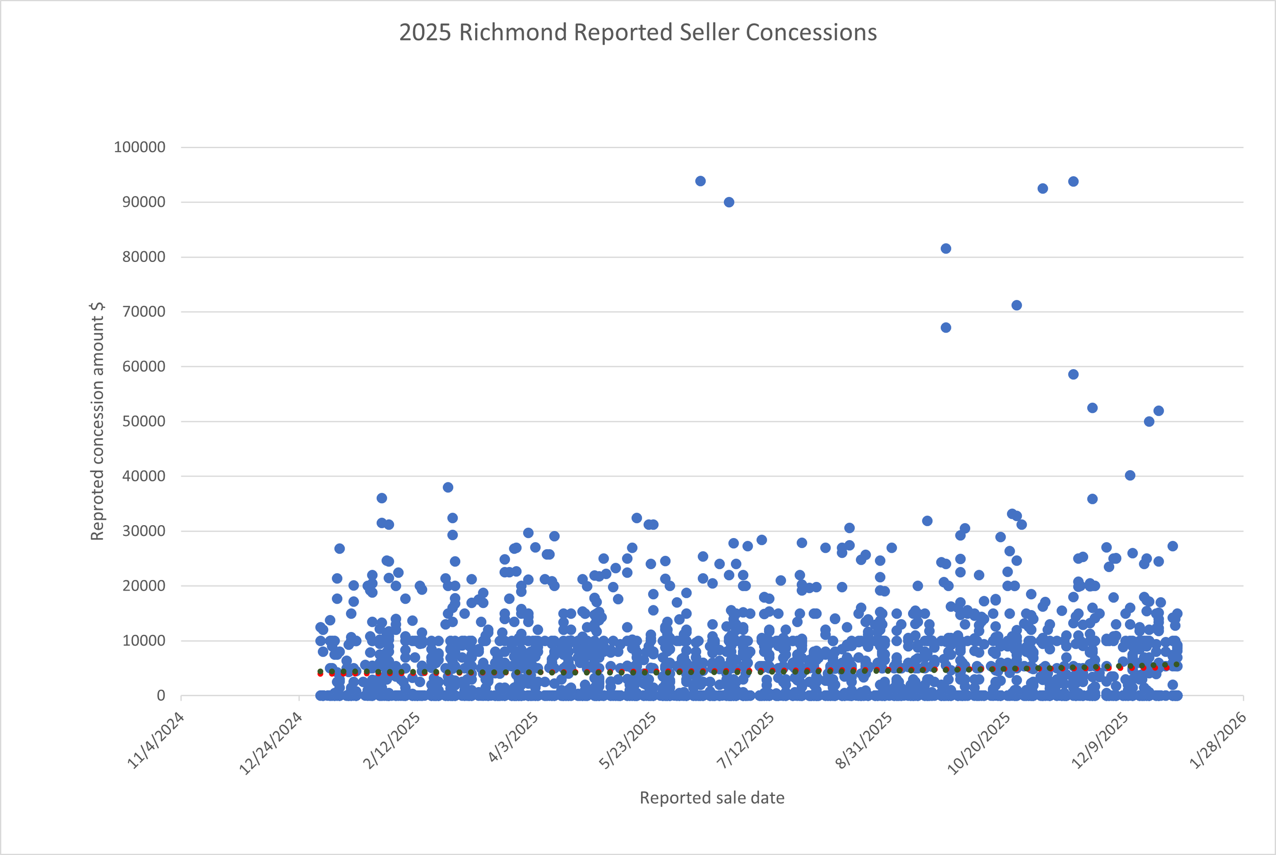 Seller concession activity increased in both frequency and magnitude as the year progressed. Later-year transactions reflect more frequent use of seller-paid concessions, indicating shifting negotiation dynamics and increasing buyer leverage.