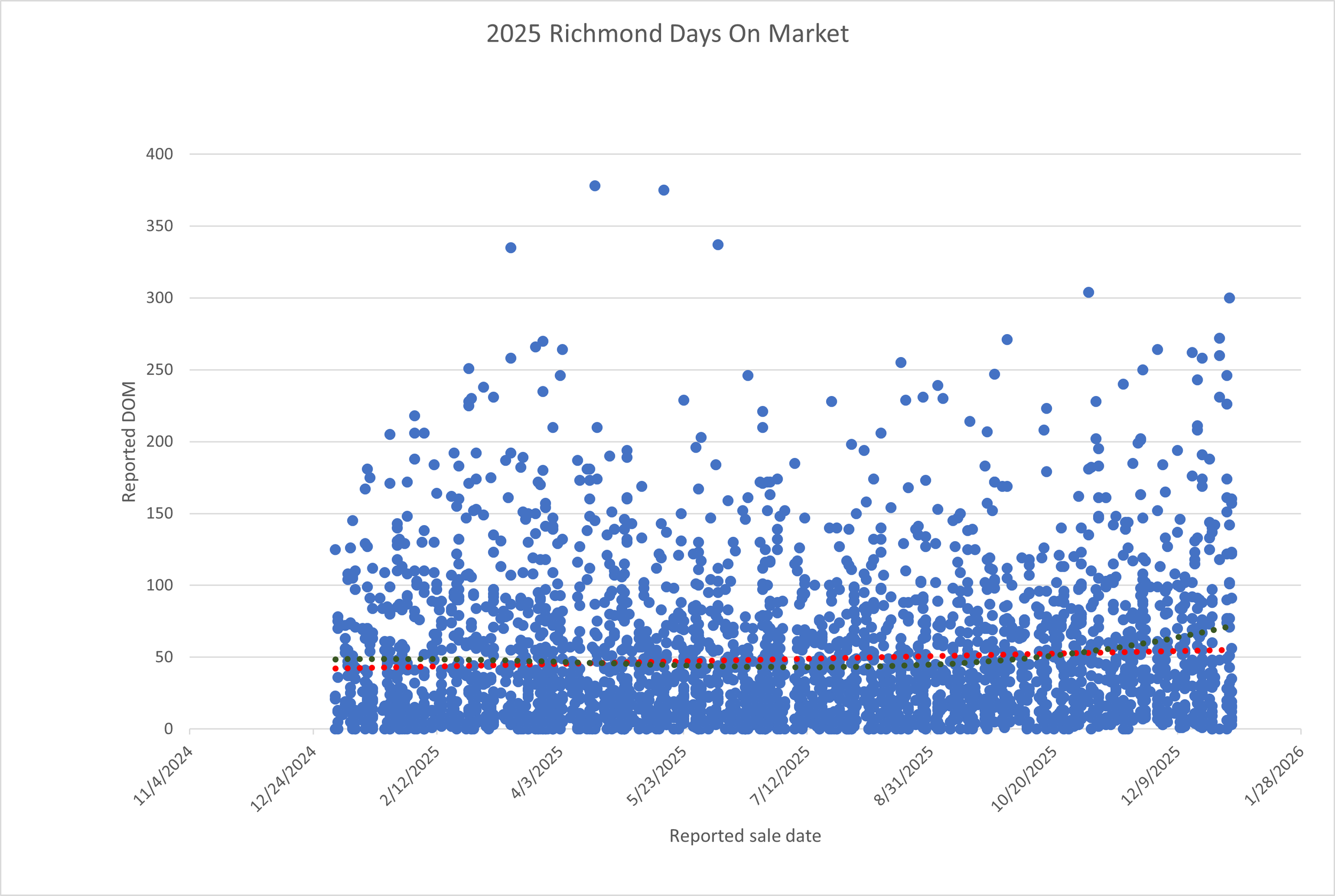 Over the course of 2025, analysis of all reported MLS sales in the Richmond market area indicates overall price depreciation at an approximate rate of $34 per day.