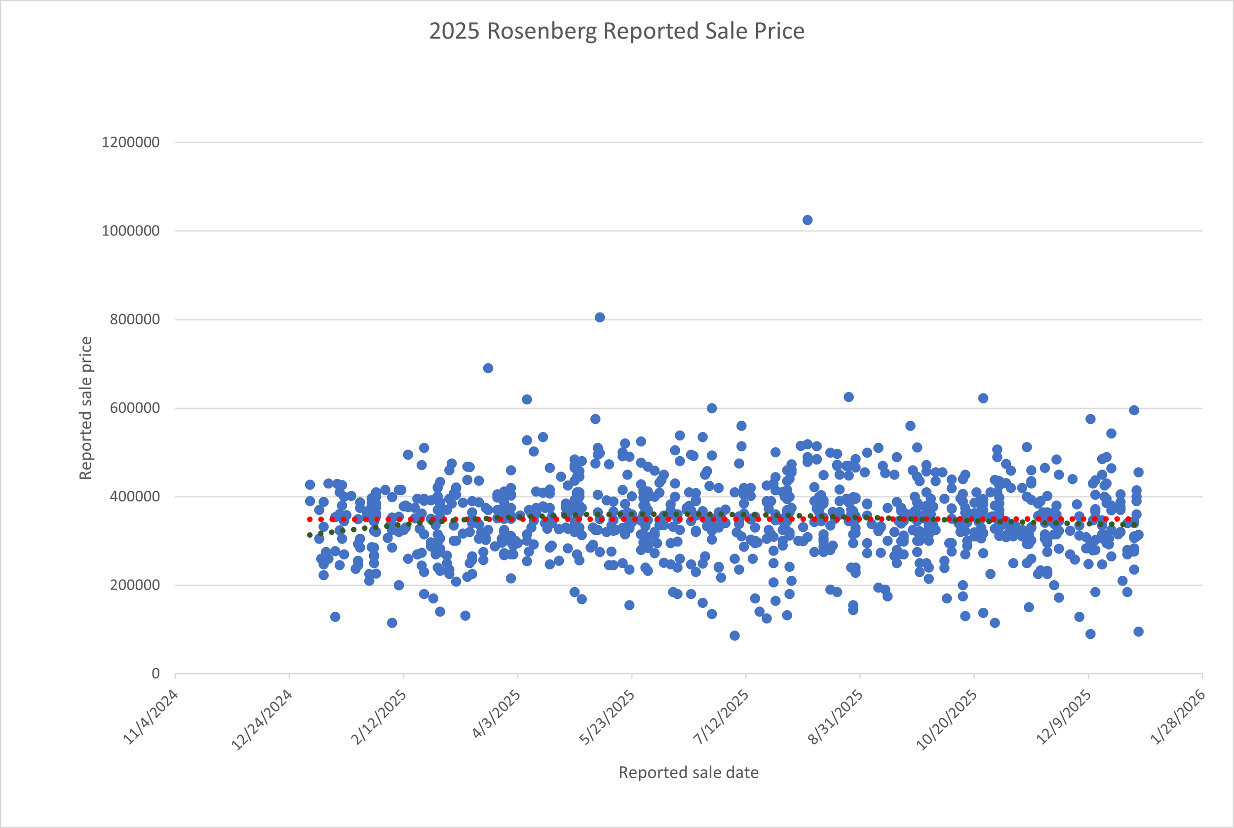 Reported sale prices in Rosenberg during 2025 exhibited a broad distribution, with most transactions clustering within a relatively consistent pricing band. While individual sales varied, the overall pattern reflects steady market participation throughout the year.