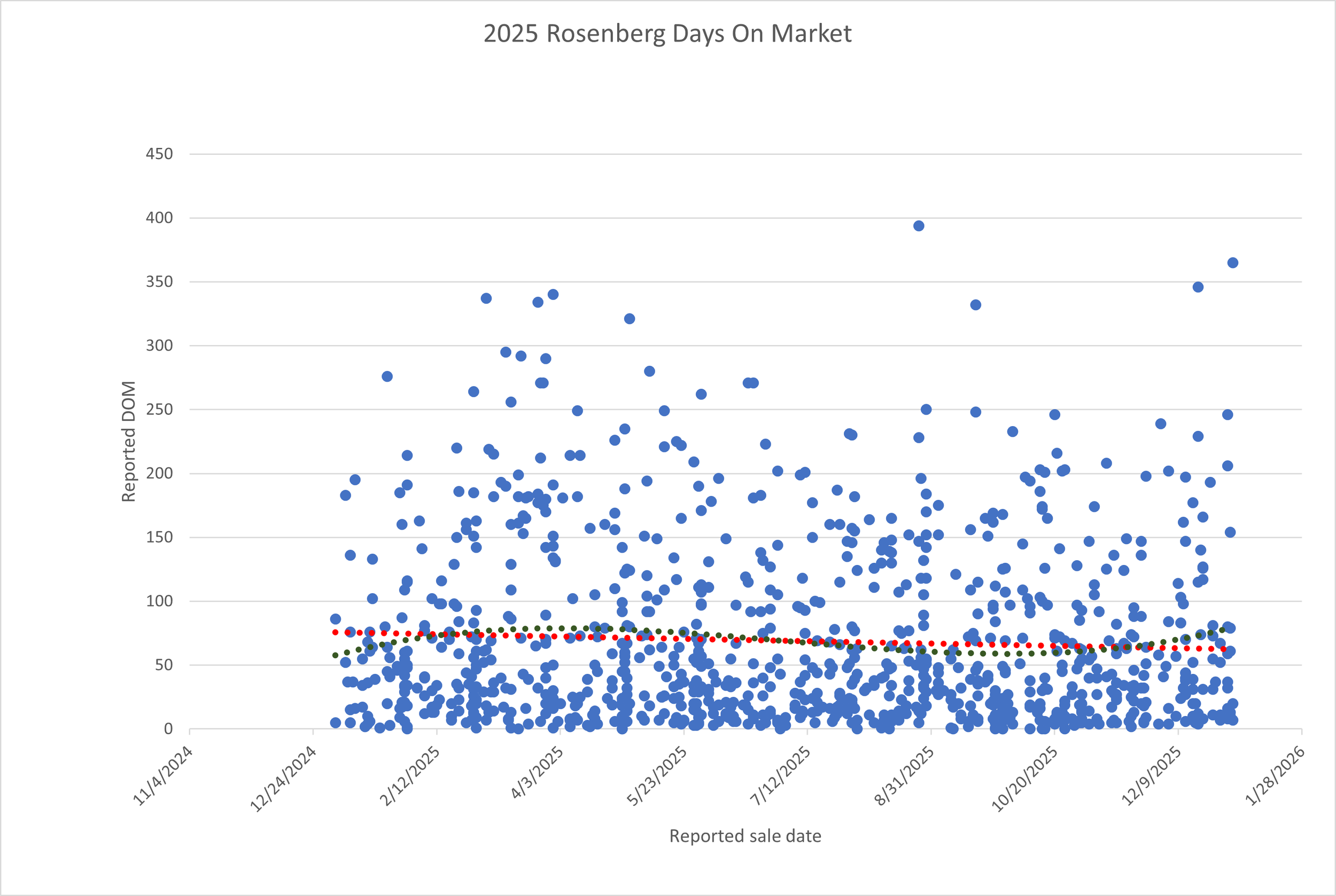 Over the course of 2025, analysis of all reported MLS closed sales in the Rosenberg market area indicates overall price appreciation at an approximate rate of $2 per day.