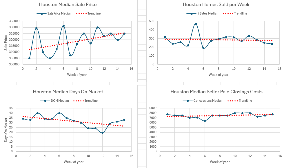 Houston’s median price increased this week, continuing the upward trend in pricing. While closed sales declined slightly, days on market increased, indicating a slower pace of transactions. Seller concessions also moved higher, suggesting buyers are still negotiating terms despite rising prices. Overall, the market is showing signs of stable price growth, but with a slight shift toward longer marketing times and continued negotiation between buyers and sellers.